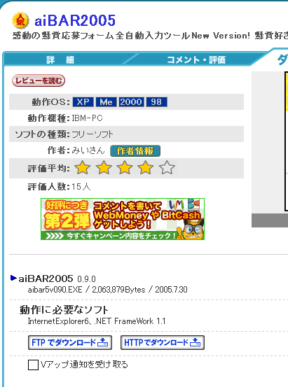 えあるまで行かなくても、当ブログからでも口座開設できるようにしましたので、良ければ活用してください。 さて、本日も予定を変更してお伝えしたいと思います! と、いいますのも、以前無料登録や資料請求でも軽く触れてはいますが、「名前や住所、メールアドレスを毎回打つのが面倒!」という方がほとんどだと思います!実際どうにかならないかという意見もありました! そこで!ワタクシ管理人・・・頑張って探してみました! 皆さん朗報です!ついに発見いたしました!! 毎回入力しなくてもある程度、自動的に入力してくれるものがありました☆(全部入力されているわけではありません) では、早速その方法をお教えしましょう♪(誰でもわかるように細かく書きます) その前に紹介するに当たりましての注意事項を必ずお読みください! *使用上の注意* 今回紹介するものは違法にソフトをダウンロードするのではなく誰でも無料でダウンロードできるソフトウェアになっております。ただし、ソフトウェアを利用するにあたってのトラブル等は一切の責任を負いかねますのでご了承ください。また、上記ソフトは違法登録等を促すものではありません。公的良俗に反しないようお願い致します。 でははりきっていきましょう。「aiBAR2005」というソフトをダウンロードを行います。 手順1 こちら をクリックして下さい。すると以下の画面が出ます。(クリックすると大きくなります) するとダウンロード開始ページに行きます。実行、保存どちらでも問題ありませんが、実行のほうが早いです。 手順2 ダウンロードが完了しましたら、あとはインストールを行うだけです。前事項で実行を選ばれたら、勝手にインストールされます。保存を選んだ方は指定した保存先に「aibar5v090」がありますのでそれをクリックするとインストール開始です。 ※たまにインストールできない方がおられると思いますが、その際はこちらクリックして下さい。 これがなければaiBAR2005が作動しません! 手順3 正常にダウンロード、インストールされましたらディスクトップ上に 手順4 上記のアイコンをダブルクリックすると下記の画面が開きます。 画面が確認できましたら、あとは各項目に入力して保存します。 以上で終わりです!! 使い方はaiBAR2005を起動させながら、インターネットを開き、会員登録等入力する項目があれば自動的にaiBAR2005に登録した入力されます。(登録した項目がない場合は各自で入力となります・・) 注意としましてあくまでも機械的判断での入力になりますので、必ず目視にて確認を行ってください。 これで何度も入力せずに少し楽に会員登録、資料請求などができるはずです。 *使用上の注意* 今回紹介したものは違法にソフトをダウンロードするのではなく誰でも無料でダウンロードできるソフトウェアになっております。ただし、ソフトウェアを利用するにあたってのトラブル等は一切の責任を負いかねますのでご了承ください。また、上記ソフトは違法登録等を促すものではありません。公的良俗に反しないようお願い致します。 次回は「ゲーム」についてをお知らせします! ポイントポータルサイト「えある」はこちらから えあるで貯めたポイントを交換するには必ず必要です!まだお持ちでない方は↓ |